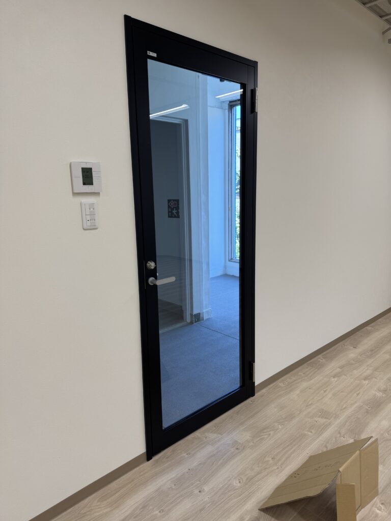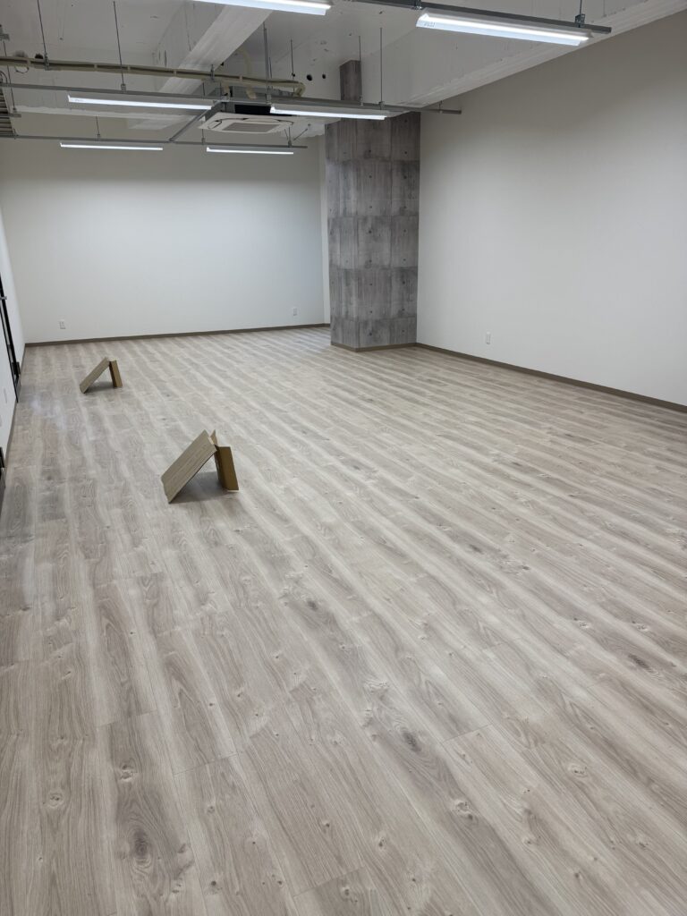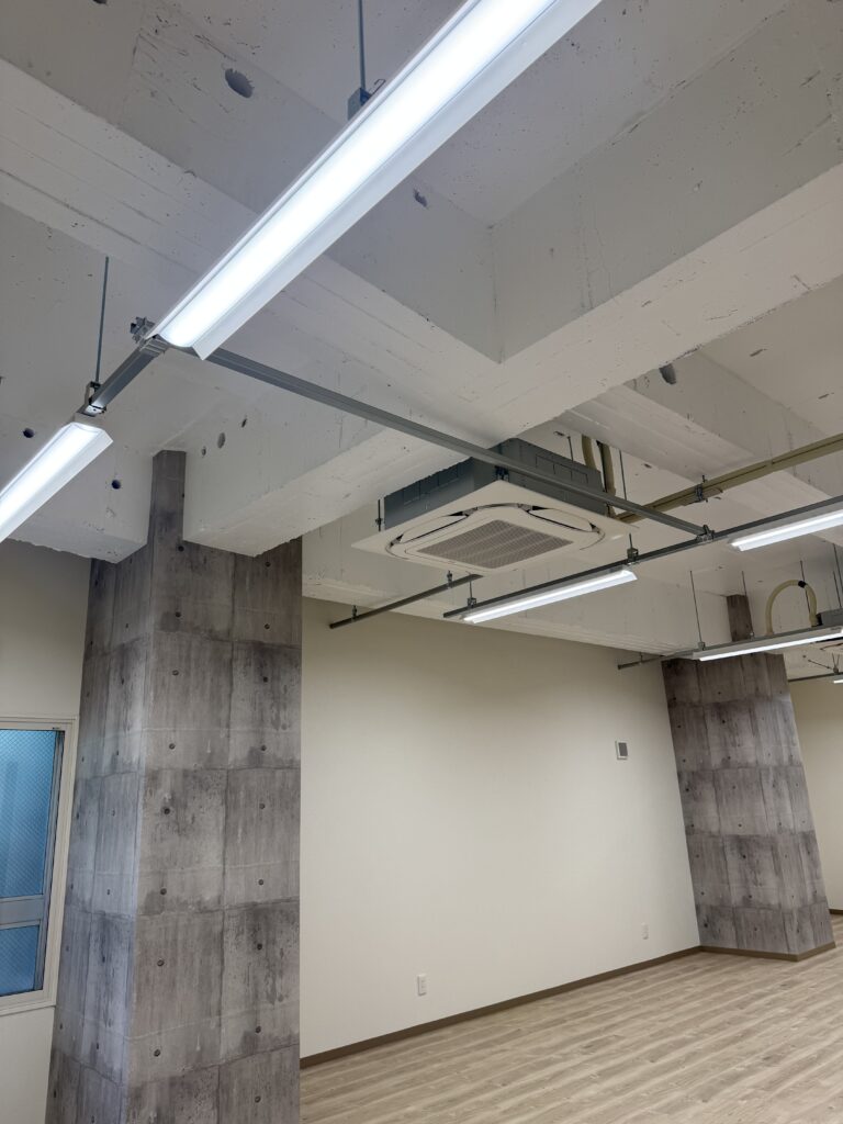 床:クッションフロアー 壁:クロス 天井:スケルトン 事務所向きベース照明 耐震補強